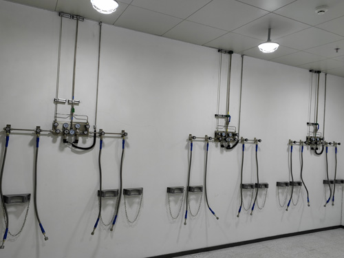 2.氣瓶間獨立設置立單次調壓的面版,這之中二托一的面版帶吹掃銅鍍鉻漆的面版4套。